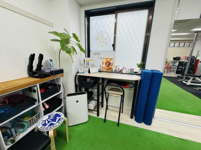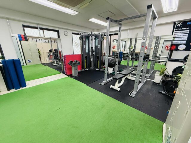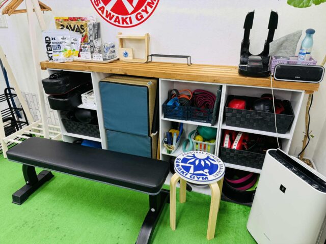 ▲テーブルも角に設置してよりスペースも広くなりました。また細かい小道具も増えているので色んなトレーニングを行うことができます。みなさんの好きなトレーニングはなんですか??私は最近背中のトレーニングを頑張っております!!目標を持ち、その目標に向かって鍛えましょう!!