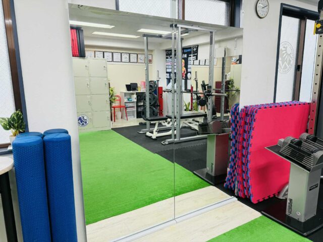 ▲鏡があるとフォームが確認できますよね。そんな鏡が正面だけでなく、横にもあるためルーマニアンデッドリフトなどの姿勢を見るときに便利になりました!!トレーニングフォームをマスターしましょう!!
