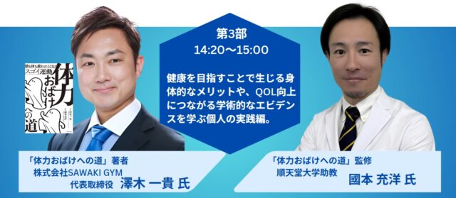 代表の澤木一貴と体力おばけへの道監修の國本充洋氏の講演では学術的な内容と短い時間で効率的な効果を出せる運動について共有されました。