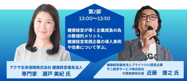 瀬戸美紀氏、近藤康之氏の講演では健康経営がもたらす企業の成長のついて、実際の事例を交えながら共有されました。
